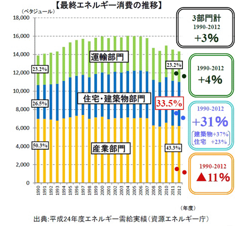 1990年と現在のエネルギー消費の推移を見ると、家庭部門のエネルギー消費が30%も増加しております。 これらの原因は、世帯数の増加等の社会構造の変化、世帯における電化製品の普及、 大型化・高機能化等ライフスタイルの変化等が考えられます。 便利で住みやすい環境を保とうとするとエネルギー消費は仕方がないとお考えかもしれませんが、 少ないエネルギーで効率よく利用できる方法を、私たちがアドバイスいたします。